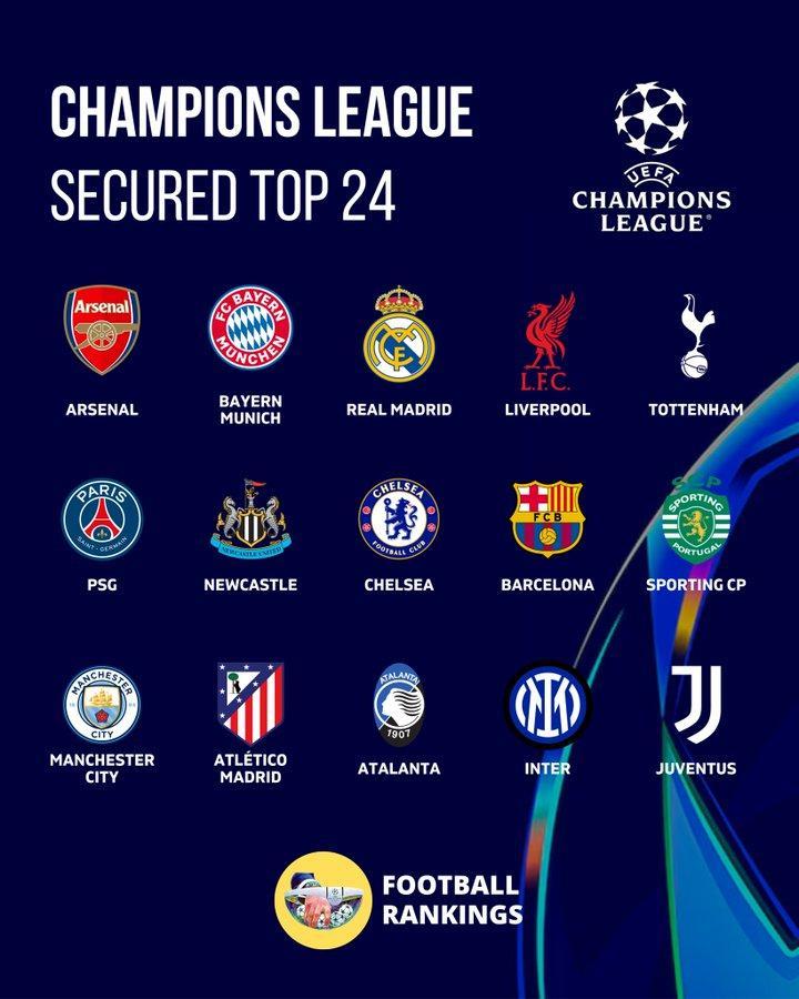 截止到目前,一共有15支球队已经确定了淘汰赛的名额,他们分别是:阿森纳、拜仁、皇马、利物浦、热刺、巴黎、纽卡、切尔西、巴萨、葡萄牙体育、曼城、马竞、亚特兰大、国米、尤文。其中,阿森纳和拜仁是确定晋级16强,不用打附加赛。